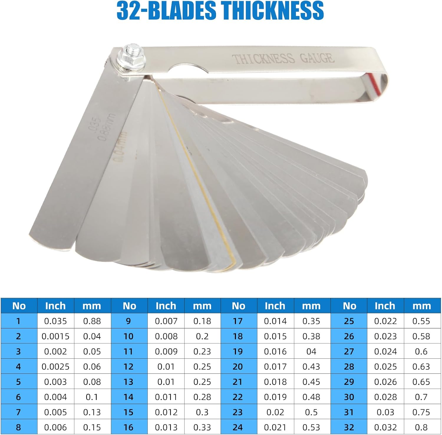 - Feeler Gauge Range: 0.0015"–0.035" (0.04mm–0.88mm), 32 blades total